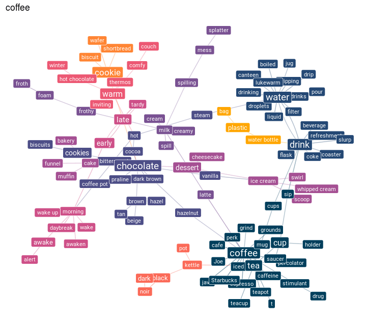 Distinctive smells like the smell of coffee tend to trigger strong associations. In the same way as the smell of coffee is associated with the process of waking up in the morning or staying awake during the day, words ‘coffee’ and ‘morning’ or ‘coffee’ and ‘break’ can be associated with each other.